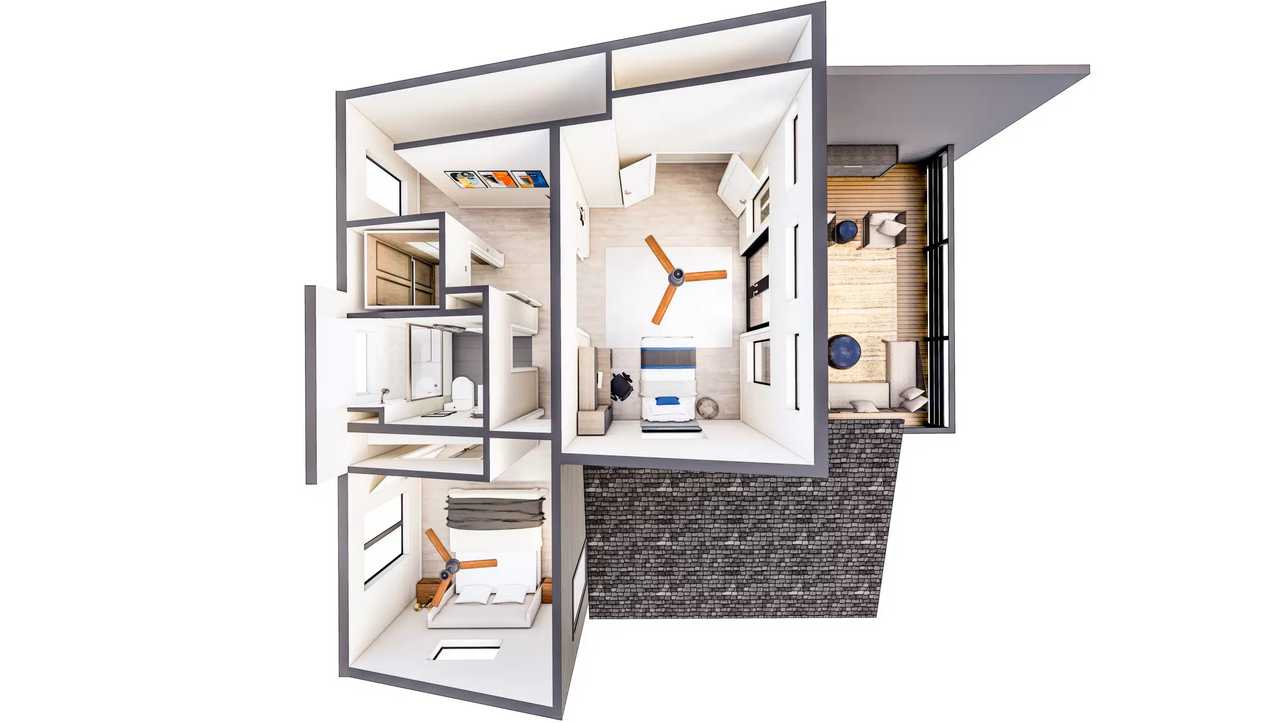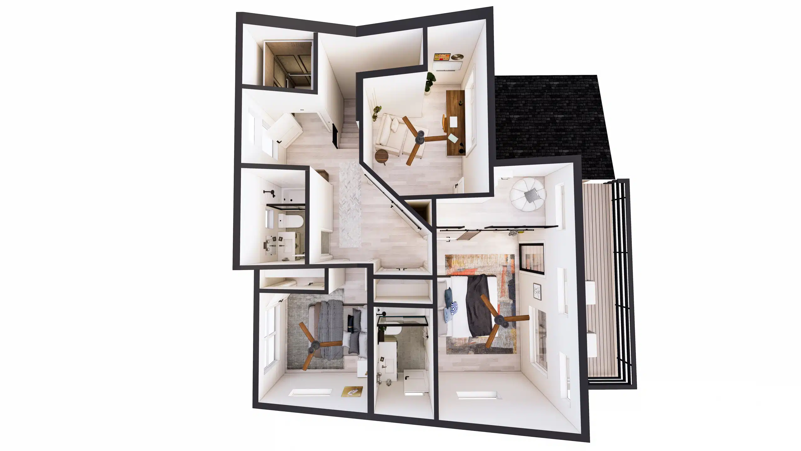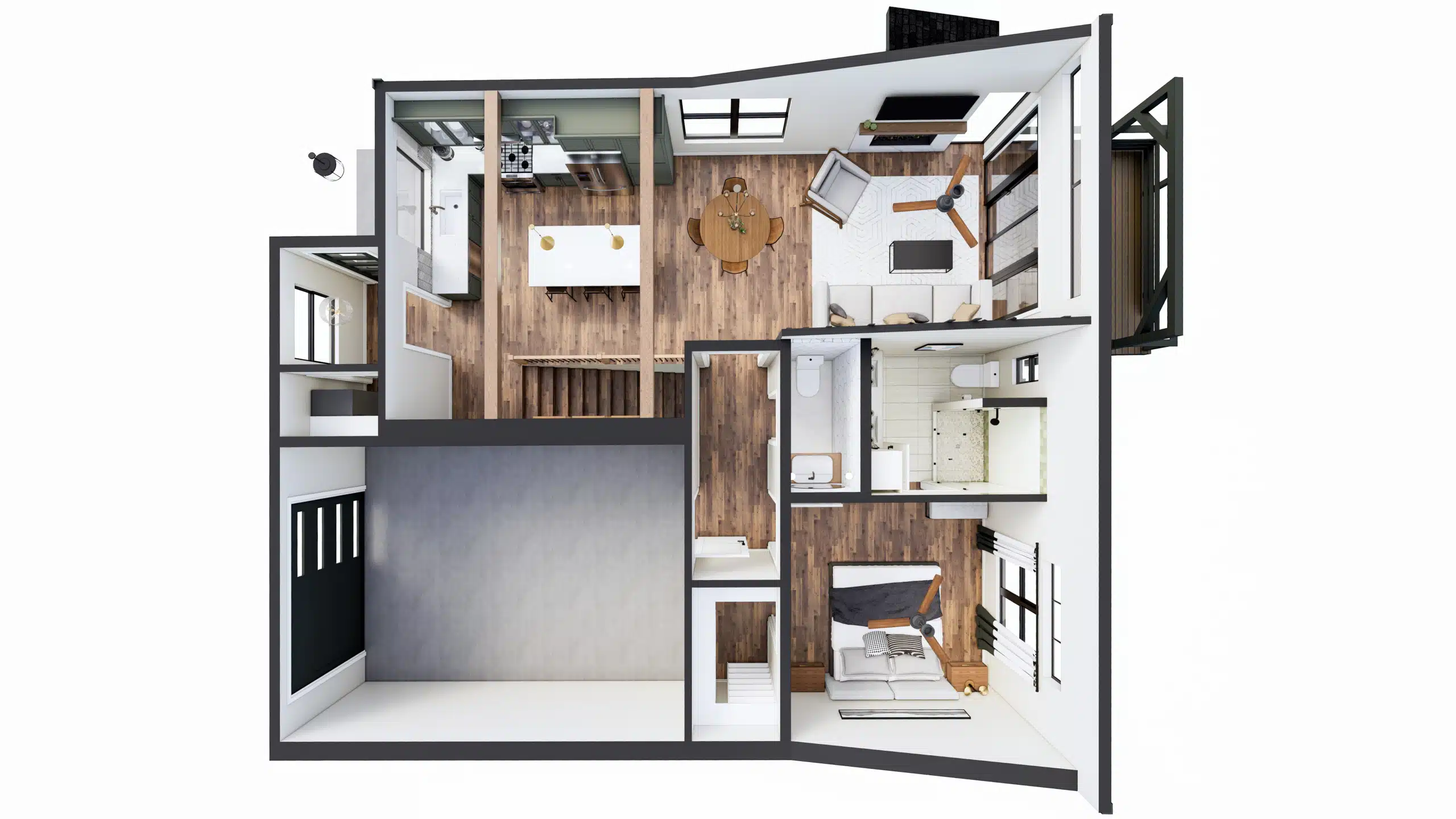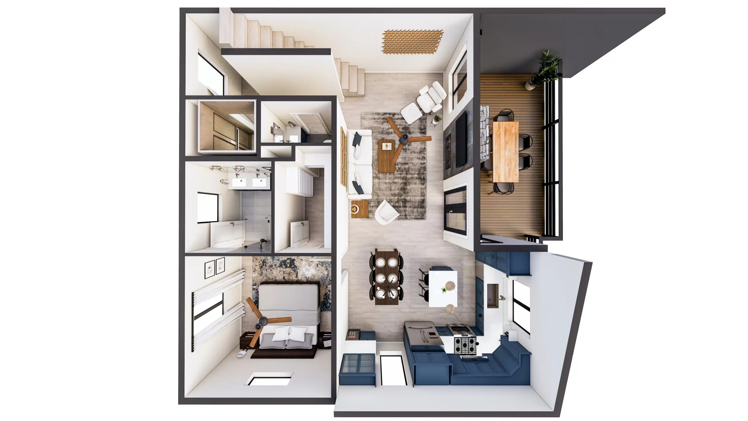 Capture a view from above of the full layout, furniture spacing, as well as design selection in our rendered floor plan offering.